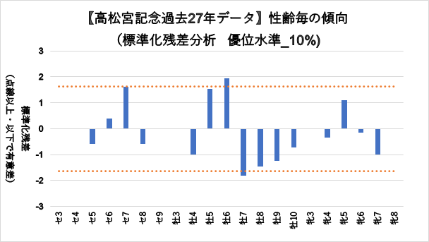 統計的に有意差があった項目について、3着内率グラフと統計処理(標準残差分析)グラフの2つを掲載しています。