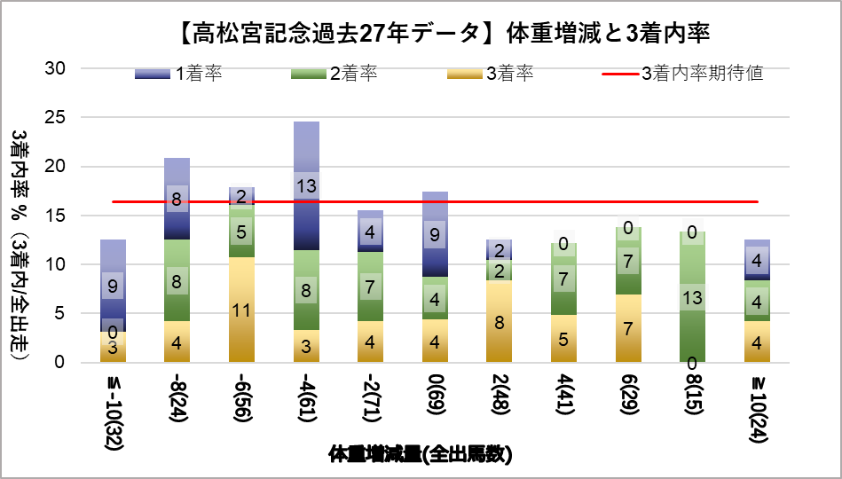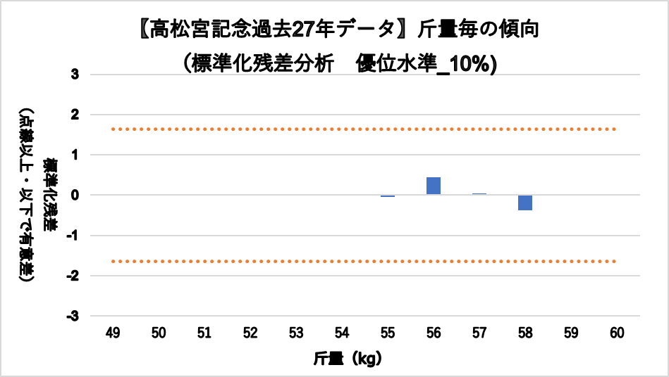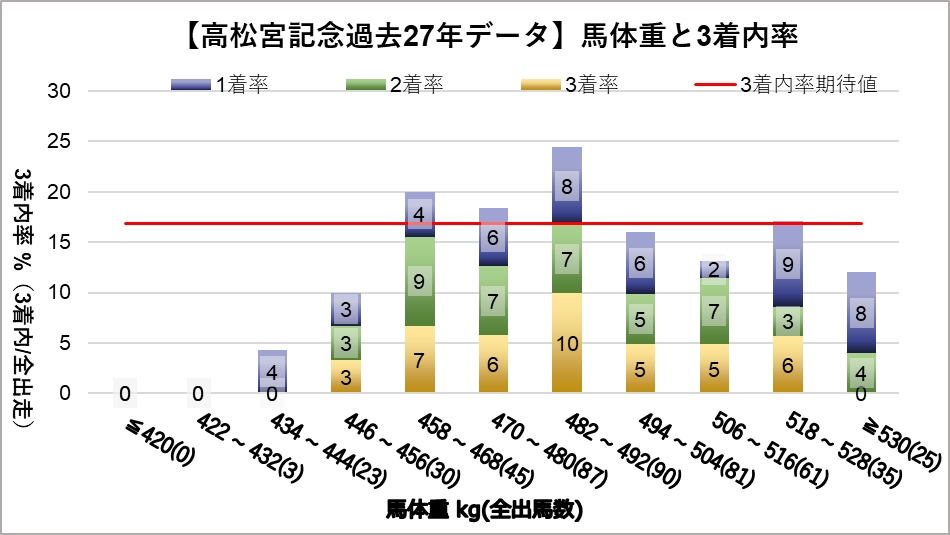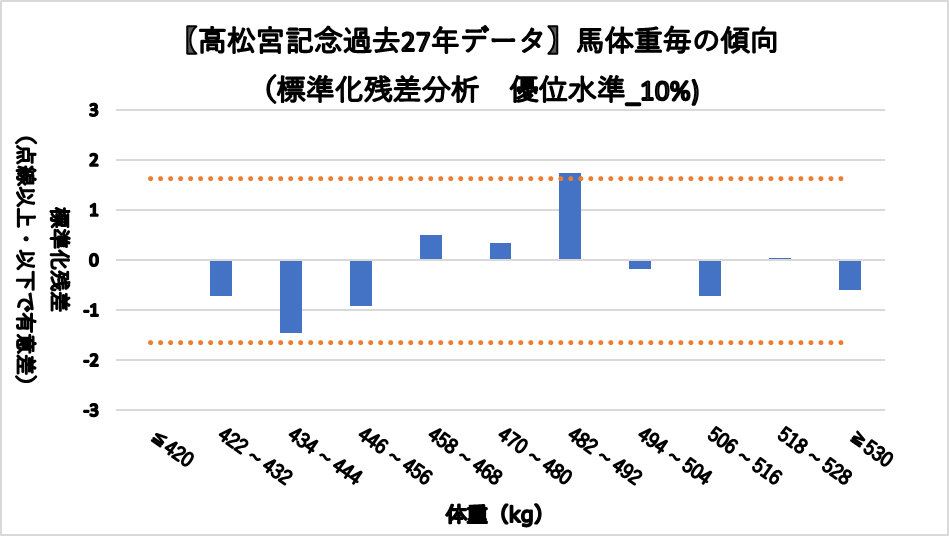 馬体重482~492kgレンジ(複勝率24.4%)において、統計的有意差が認められ、平均複勝率(17%)よりも好走する傾向が見られた