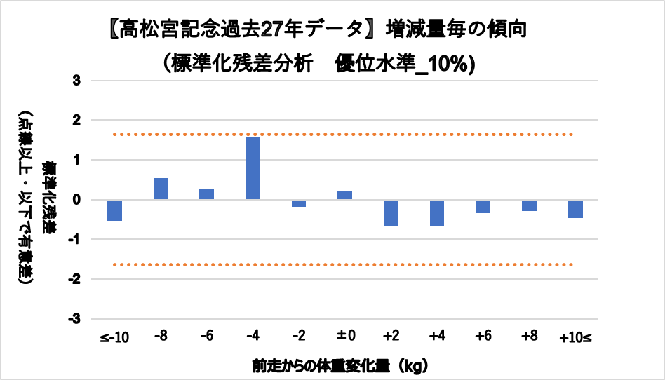 増減量-4kgの好走傾向がみられるものの、統計的な有意差は認められなかった。