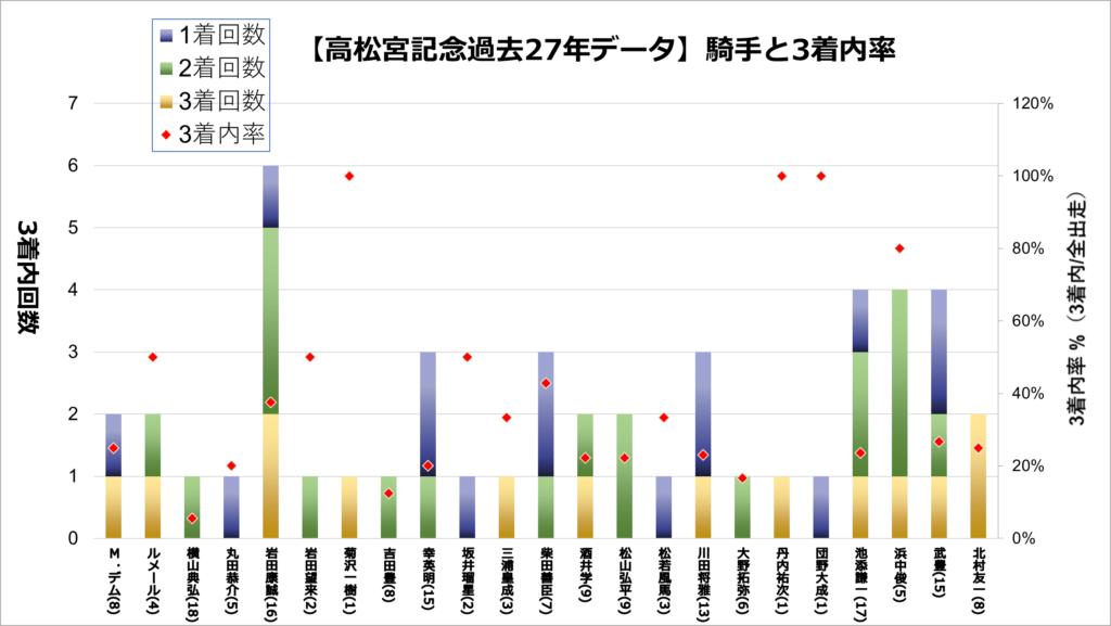 ※3着内に一度も入ったことがない騎手は記載なし。