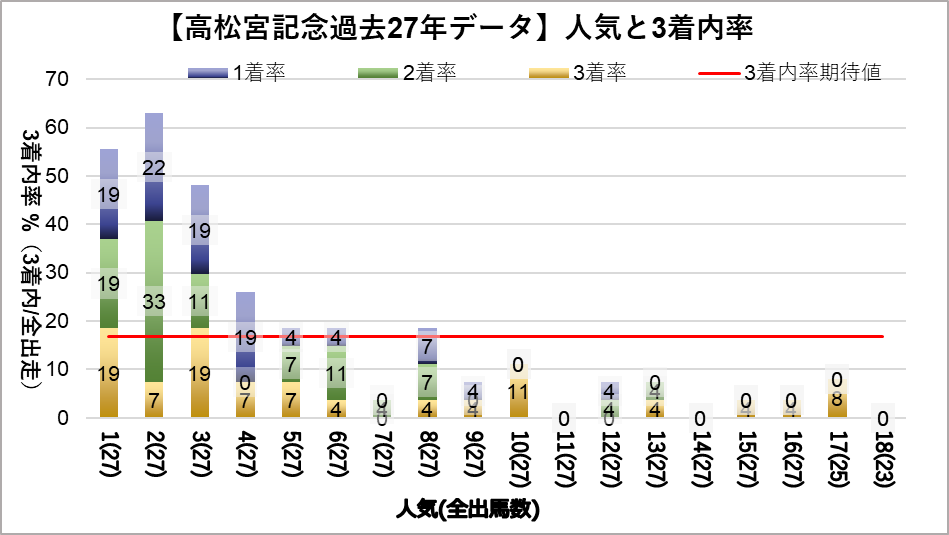 - 1人気(複勝率55.6%)、2人気(複勝率63.0%)、3人気(複勝率48.1%)