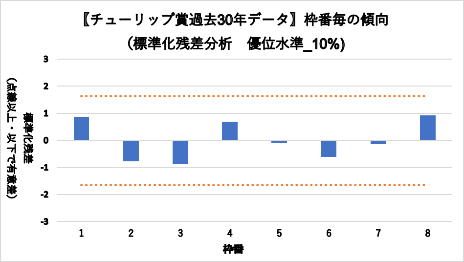 2, 3枠が若干凡走傾向であるように見えるが、統計的な有意差は認められなかった。