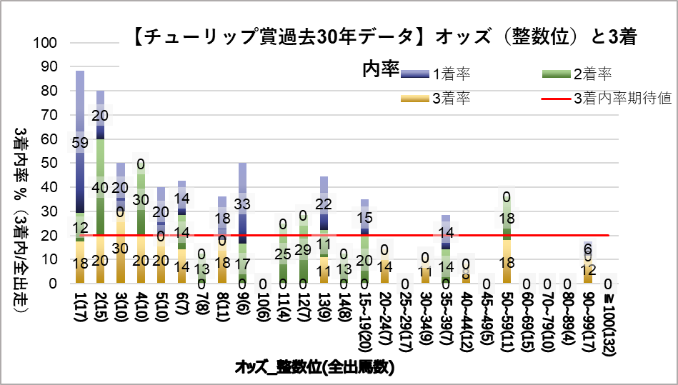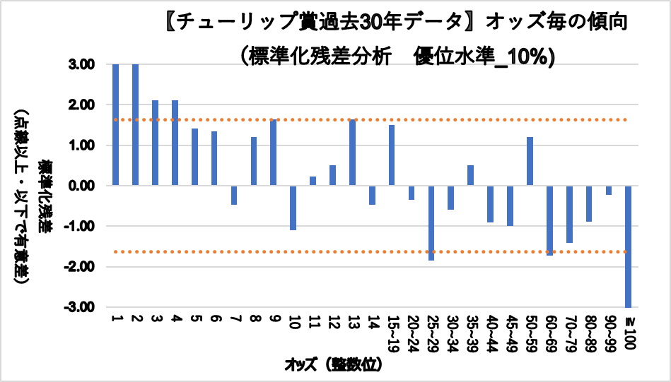 一方、25.0~29.9倍, 60.0~69.9, 100倍以上は統計的に見ても有意に凡走傾向である。
