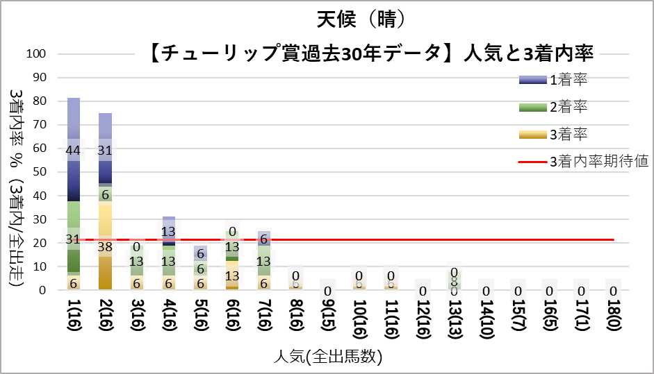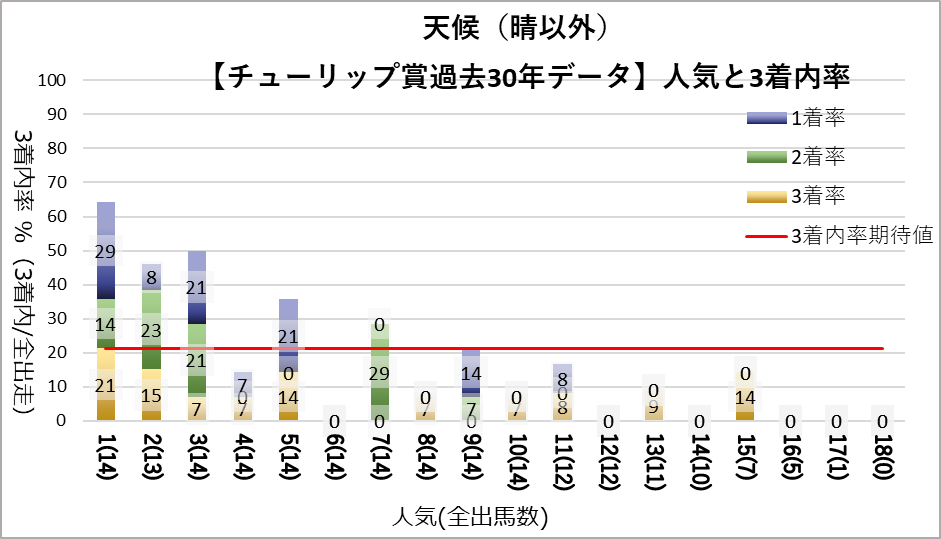1,2人気が常に好走する傾向だが、晴以外・良芝以外の条件下だと15番人気までの低人気も馬券に絡んでいる。