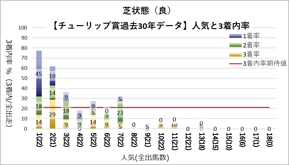 1人気(複勝率73.3%)、2人気(複勝率62.1%)これらの人気に統計的有意差が認められ、平均複勝率(21%)よりも好走する傾向が見られた。