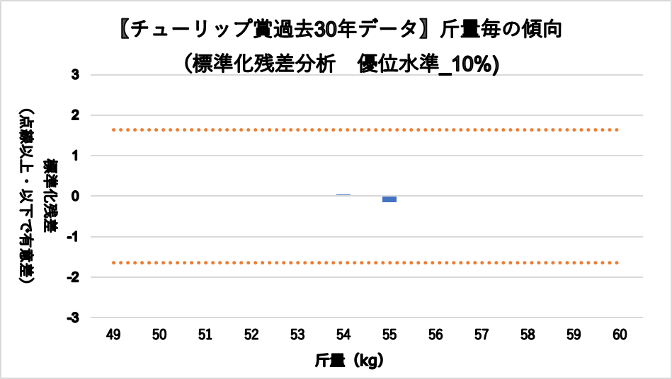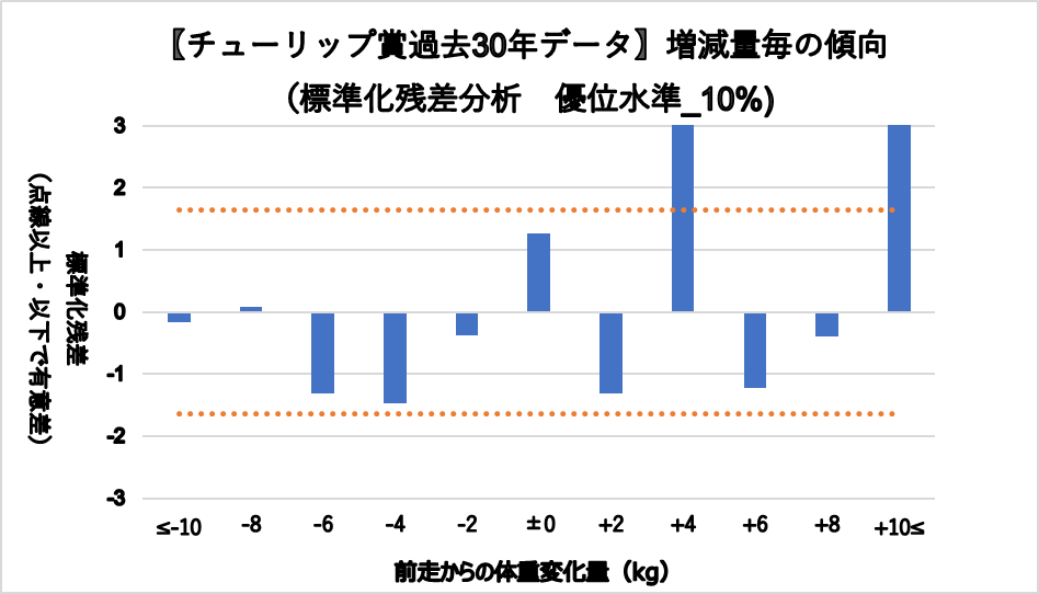 増減量+4kg(複勝率55.0%)と+10kg以上(複勝率58.8%)に統計的有意差が認められ、平均複勝率(%)よりも好走する傾向が見られた。