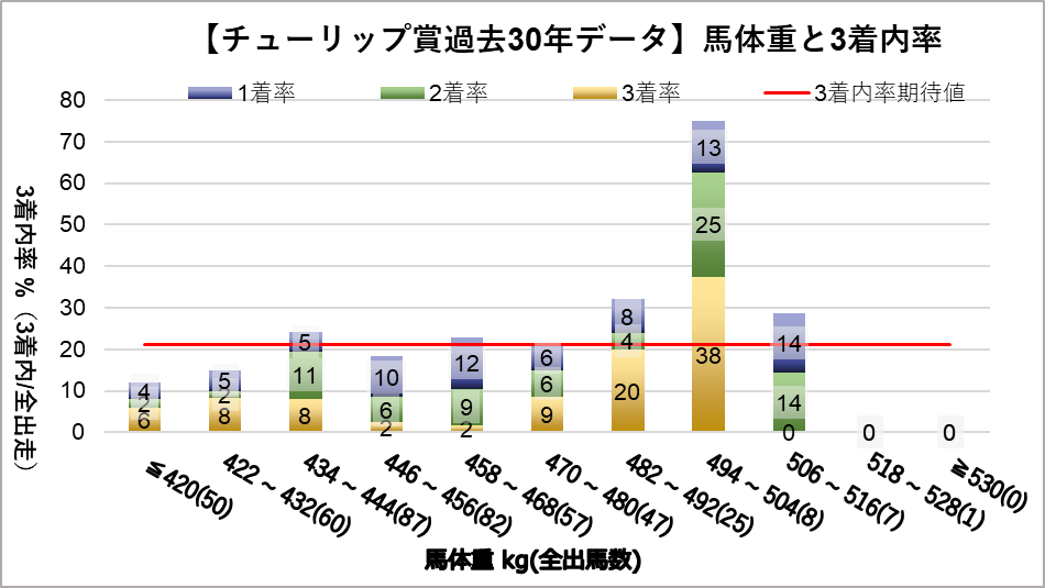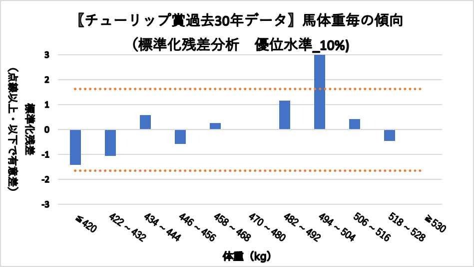 馬体重494~504kgレンジ(複勝率75.0%)において、統計的有意差が認められ、平均複勝率(21%)よりも好走する傾向が見られた