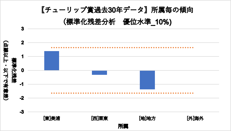統計的に有意差があった項目について、3着内率グラフと統計処理(標準残差分析)グラフの2つを掲載しています。